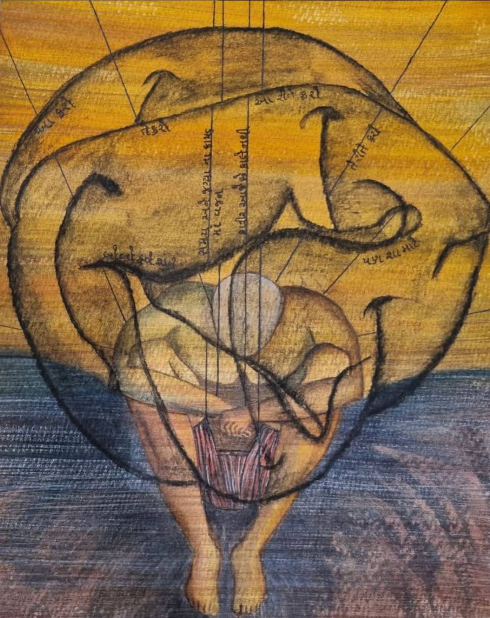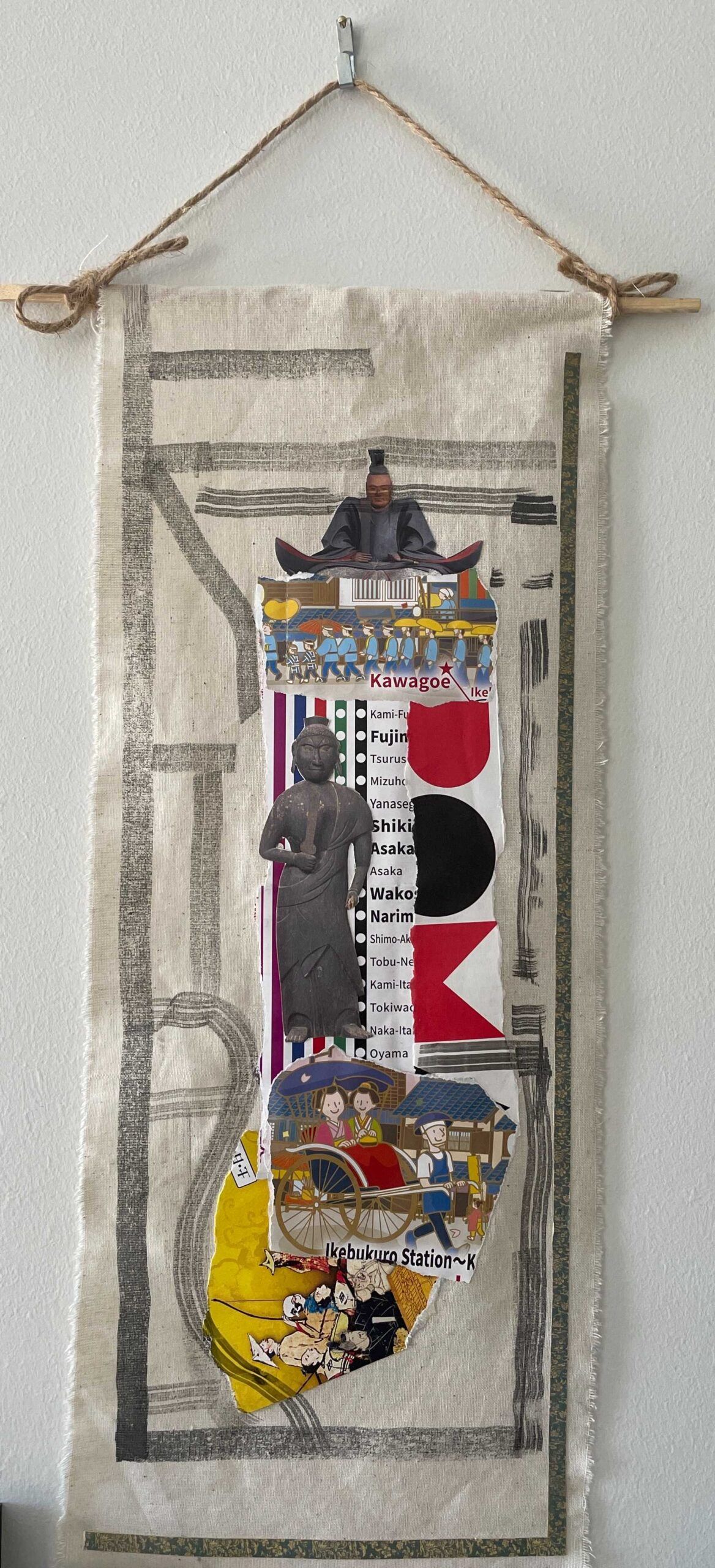Ink, collage, string on cloth