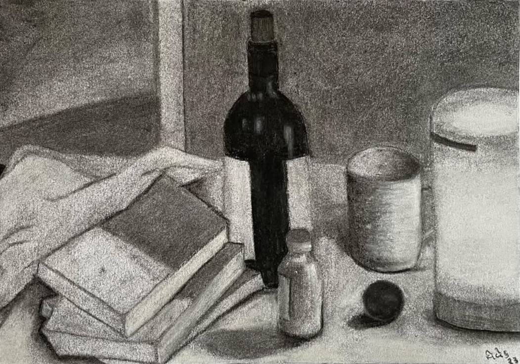 Still life (books and wine bottle)