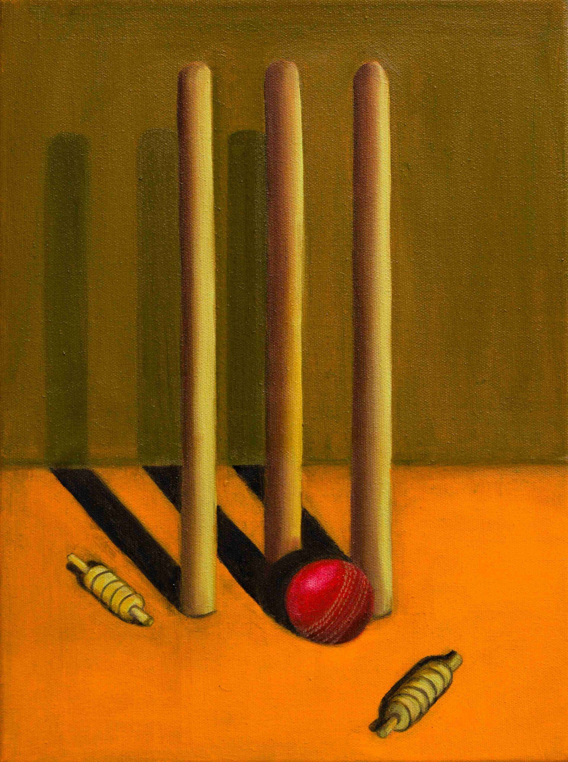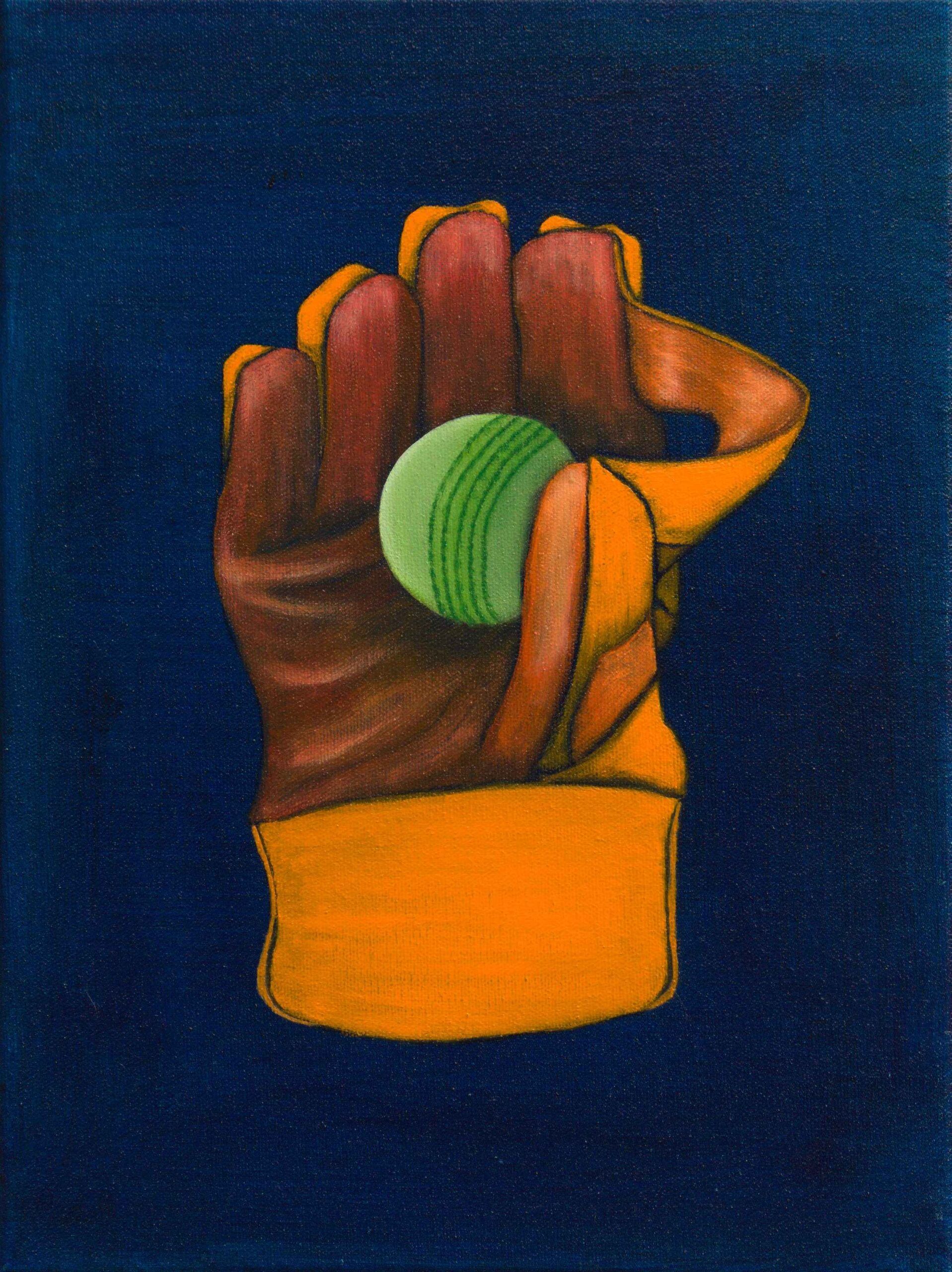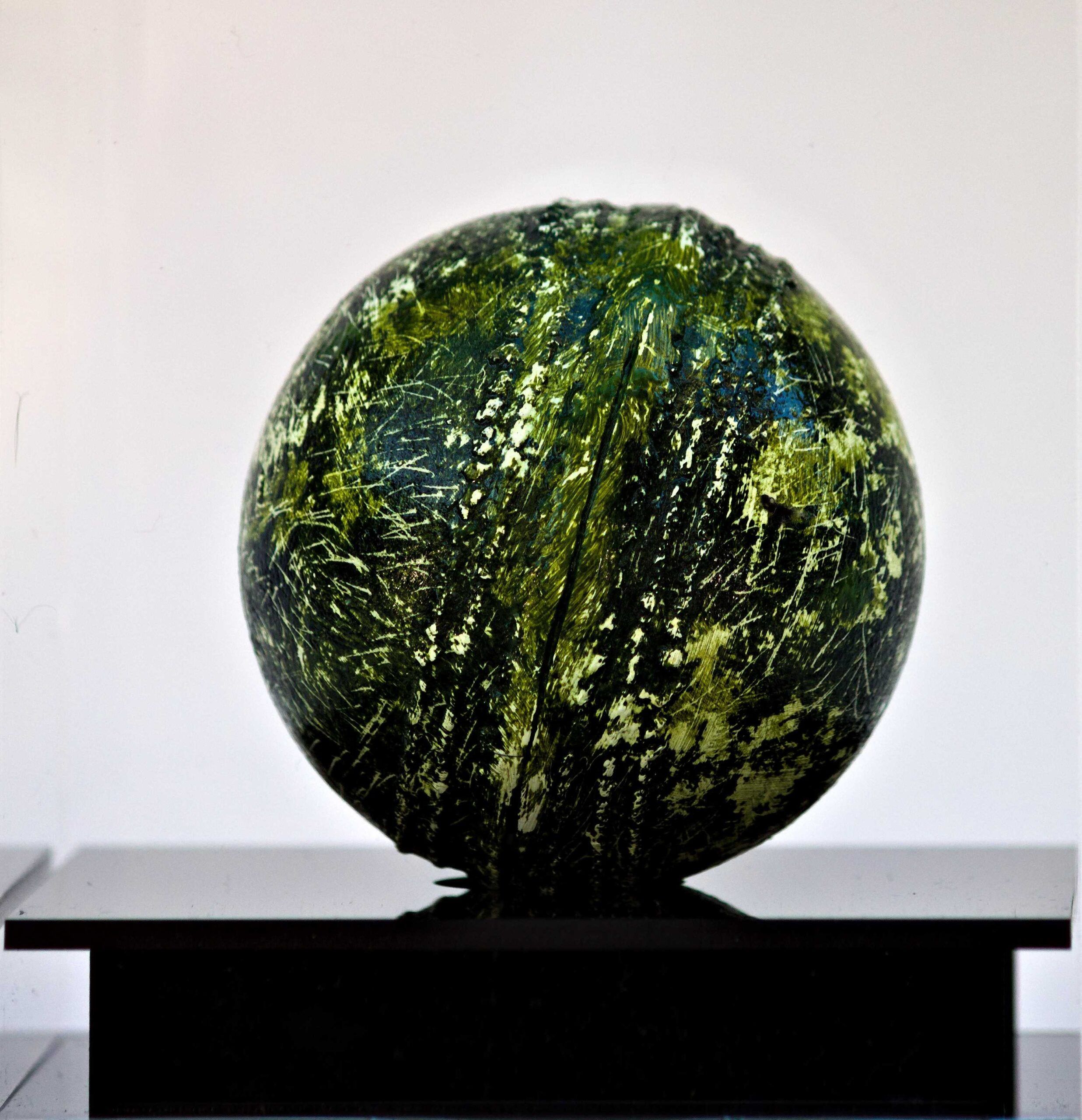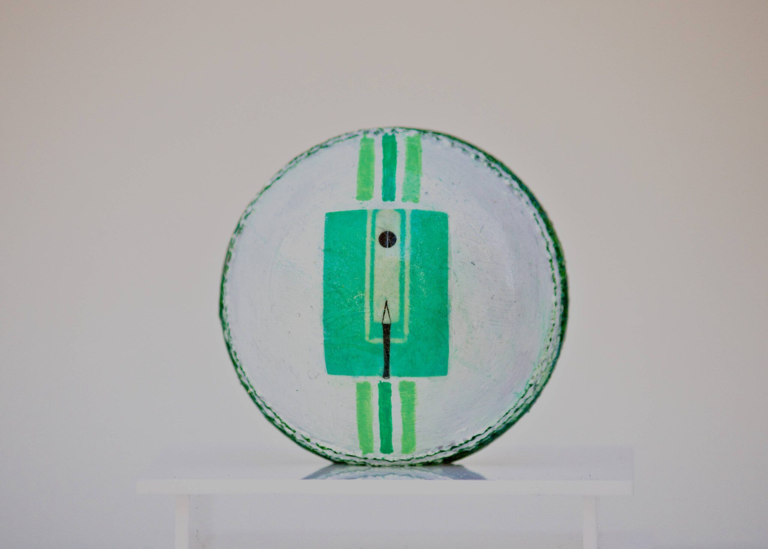 Oil paint and protective varnish on Cricket ball with acrylic case