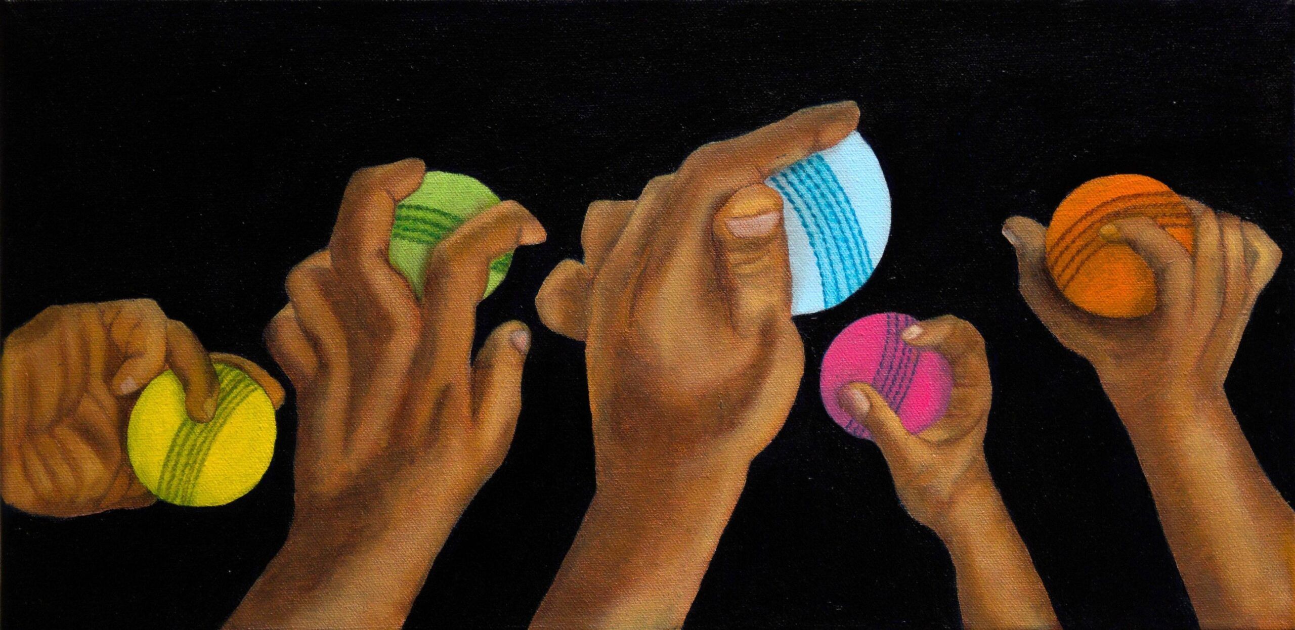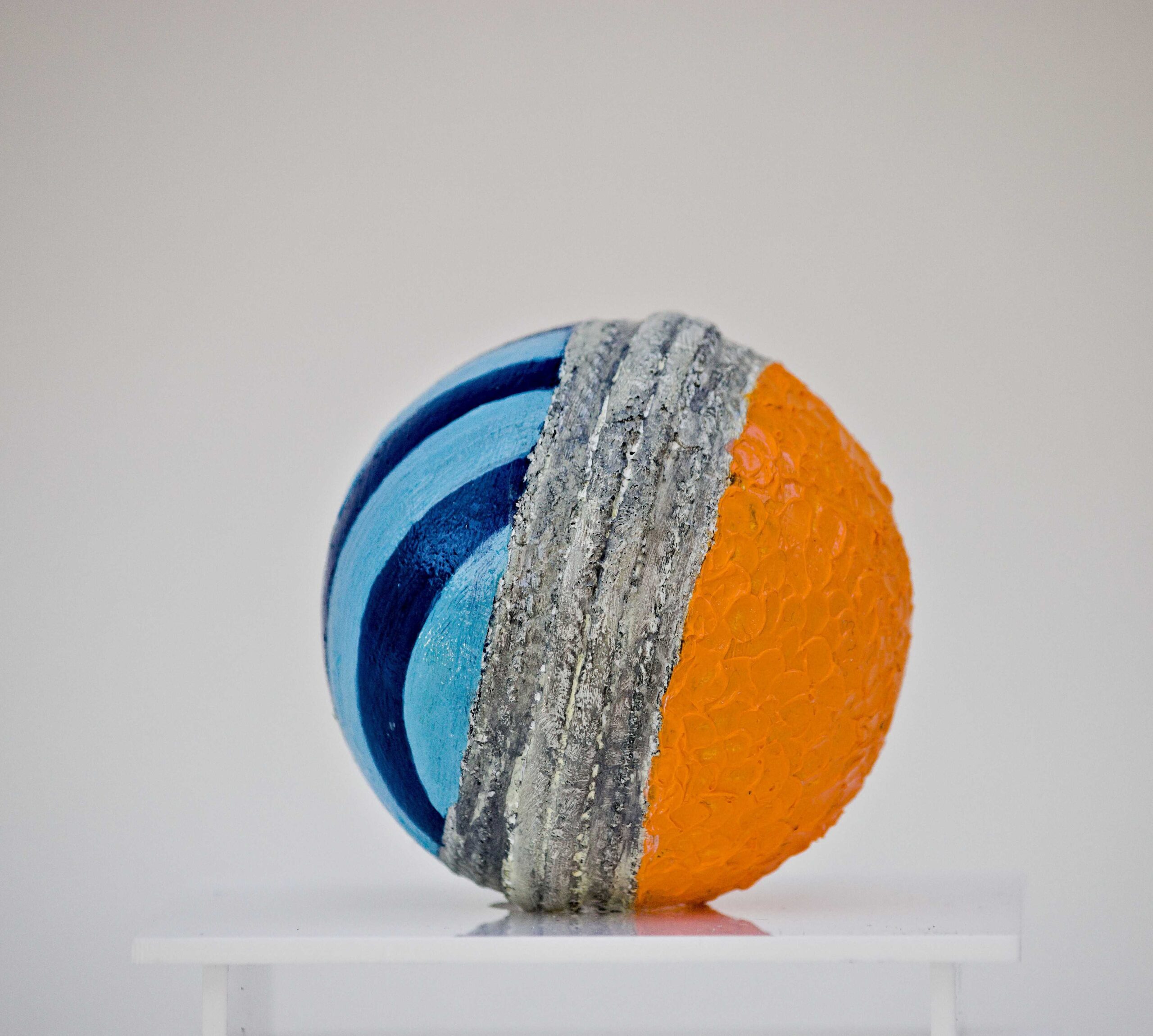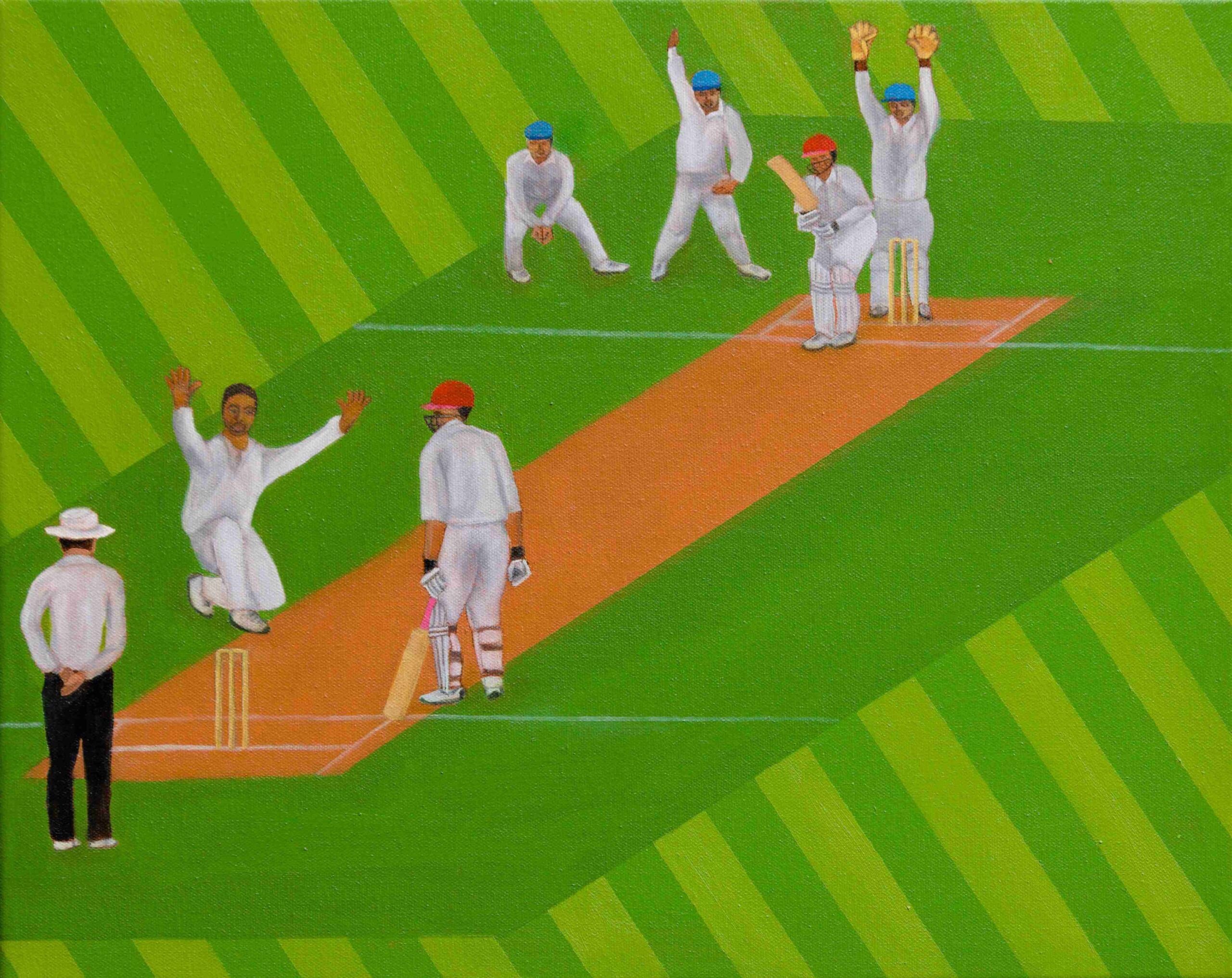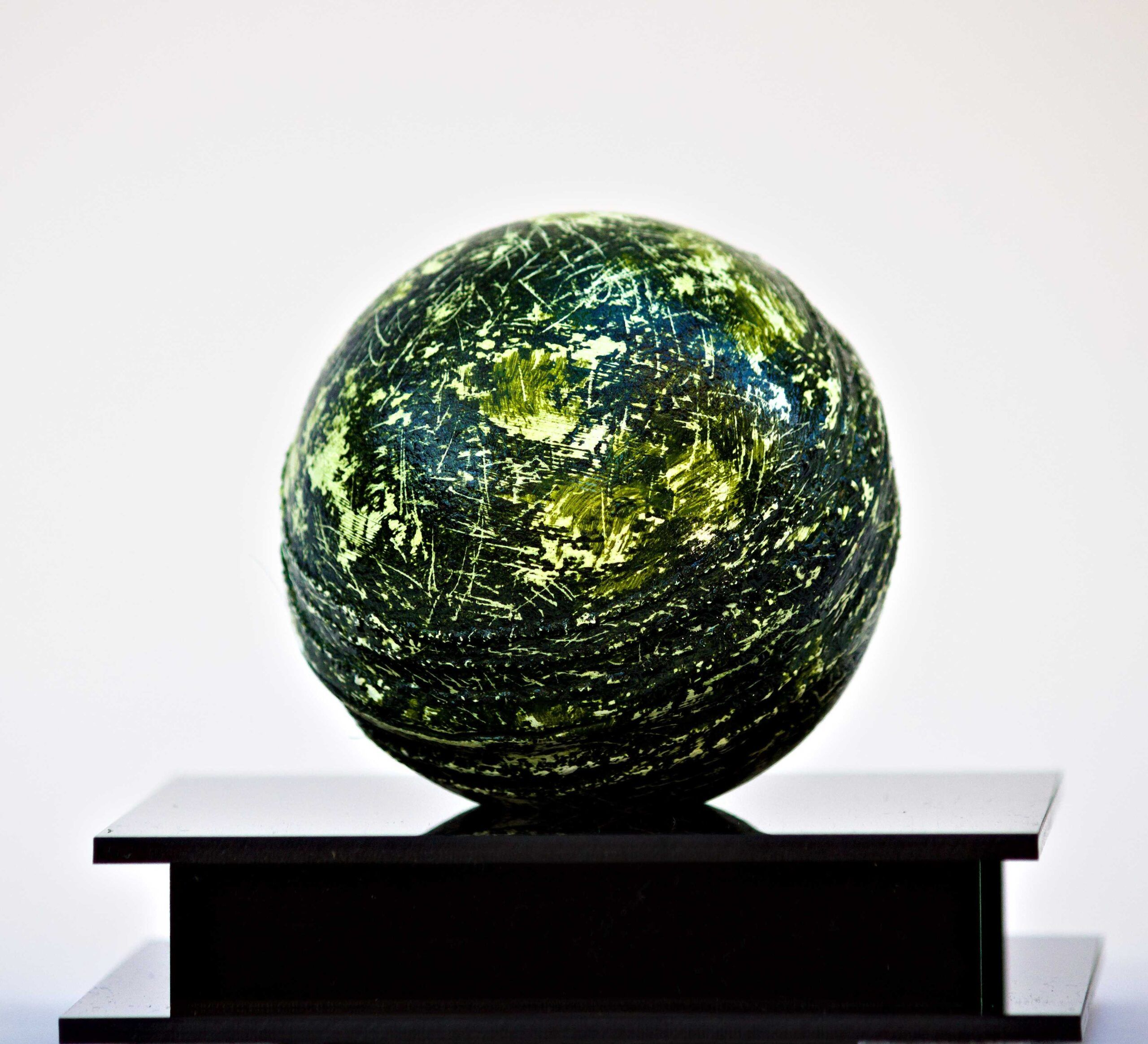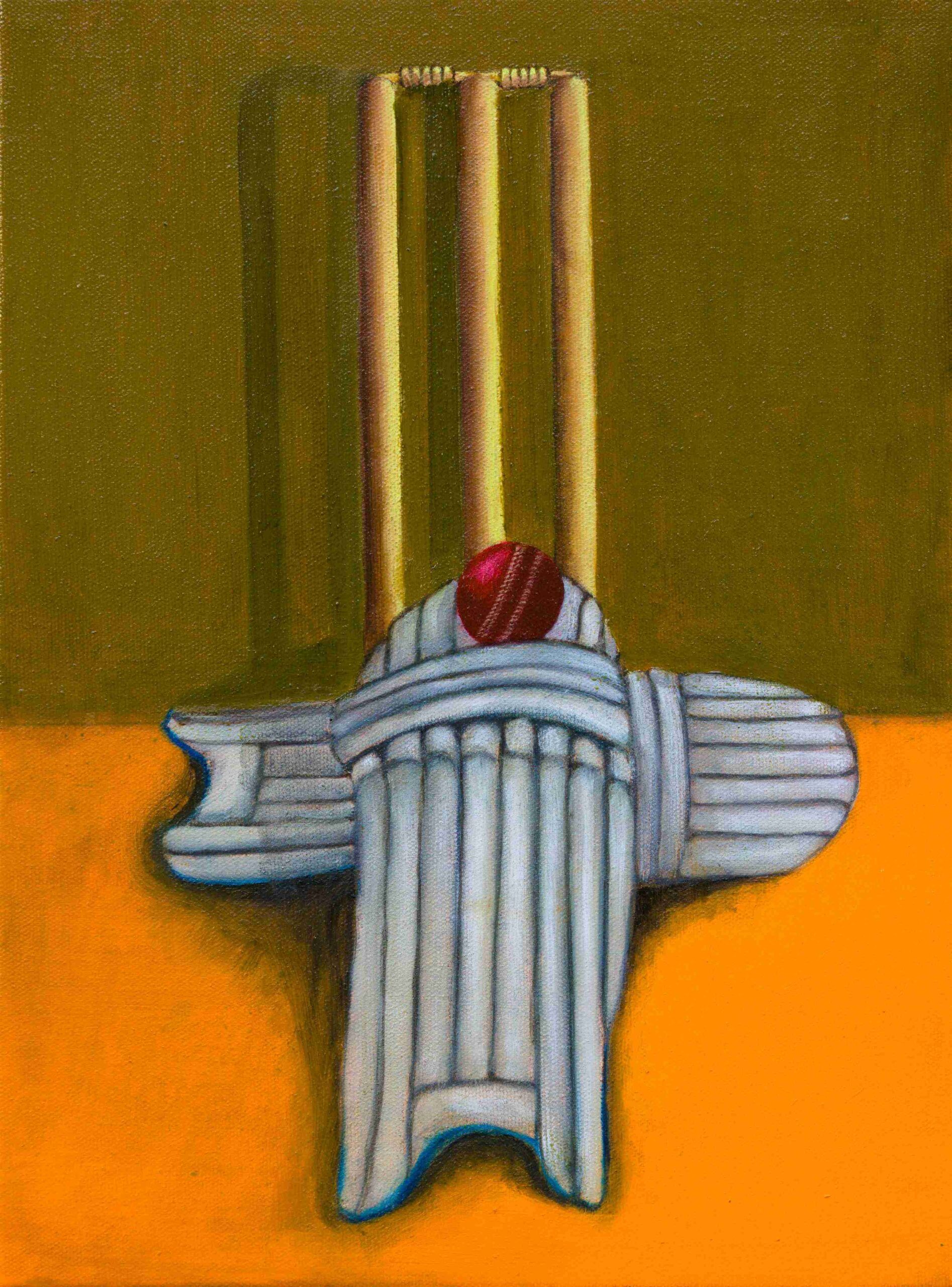 Oil paint and protective varnish on Cricket ball with acrylic case