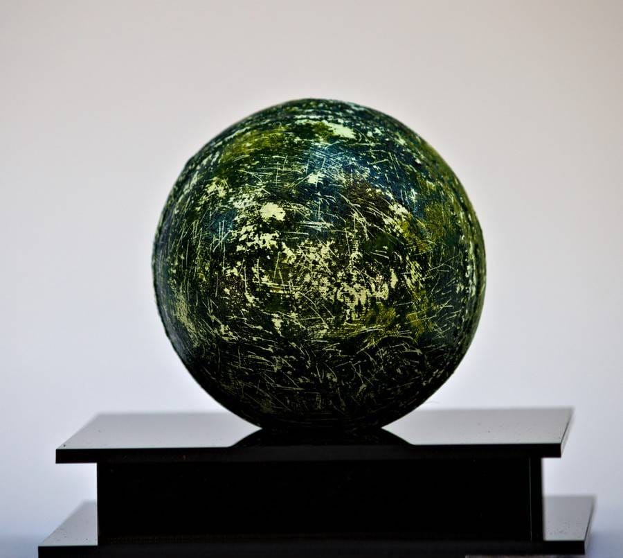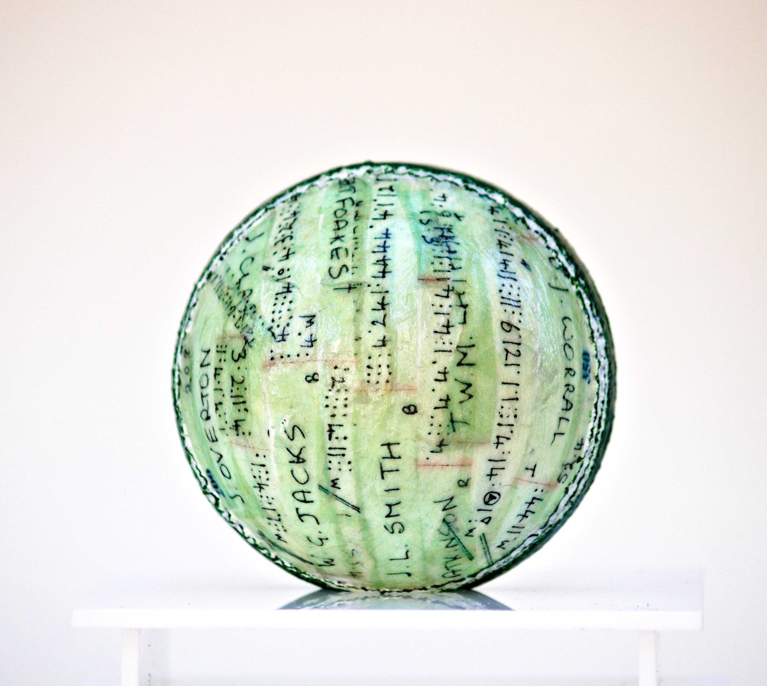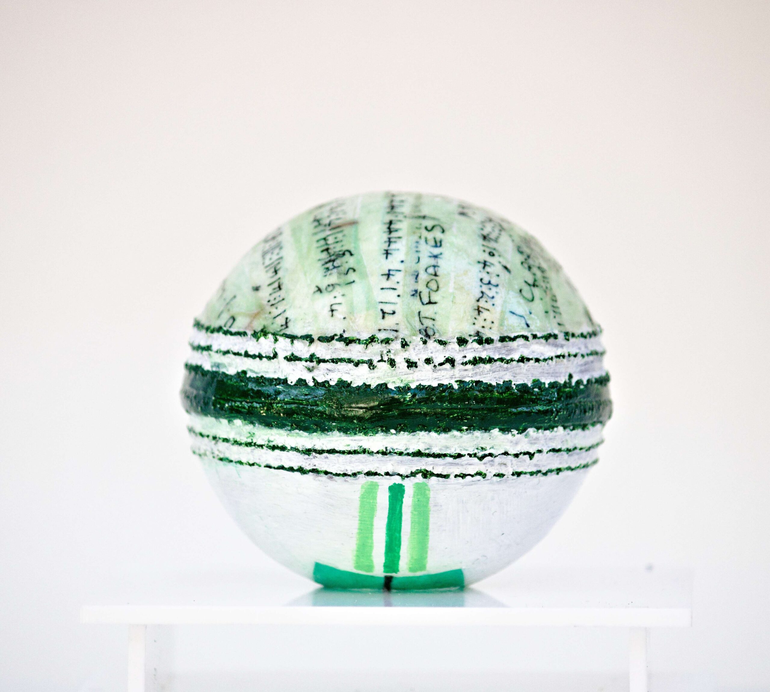 Pen and protective varnish on Cricket ball with acrylic case