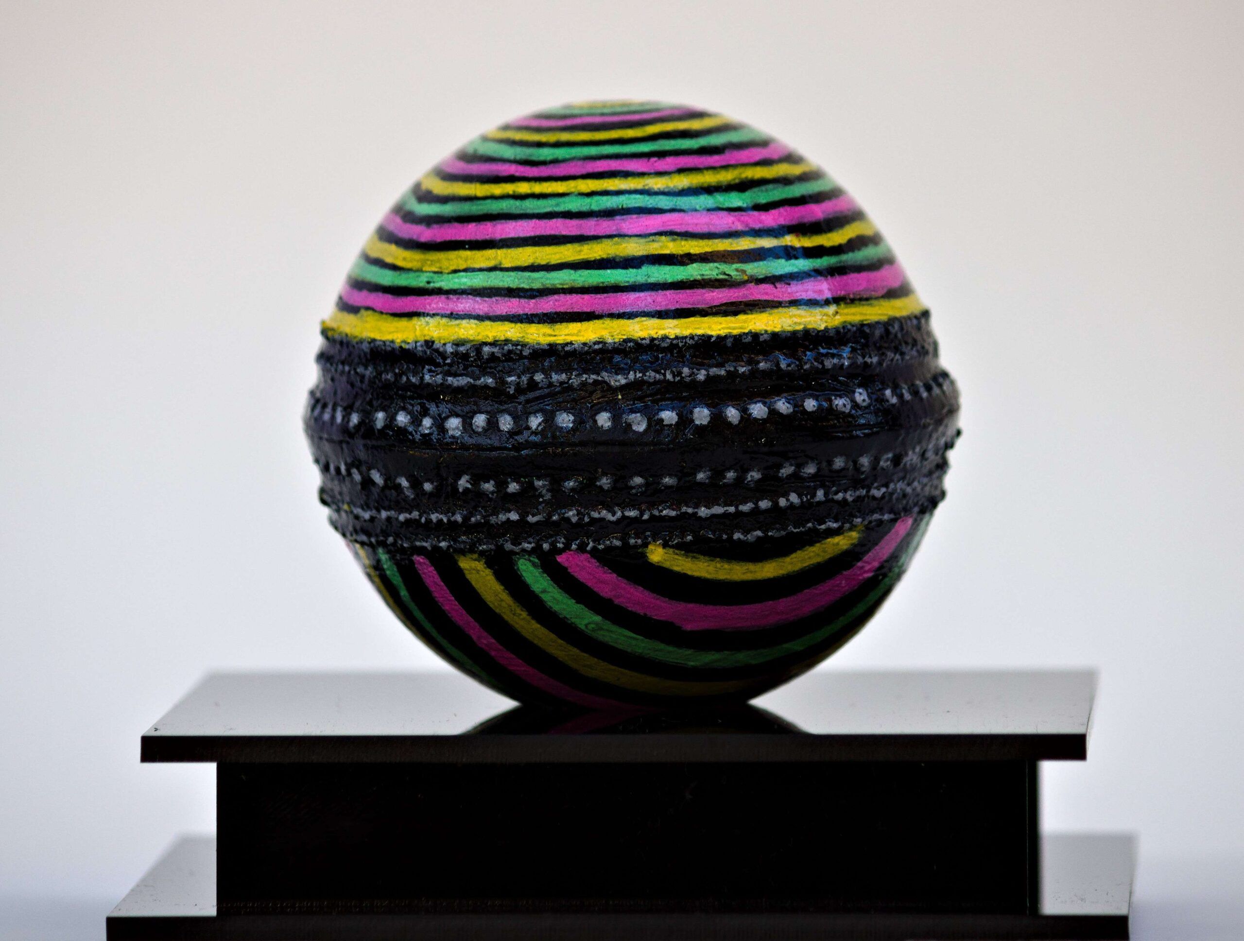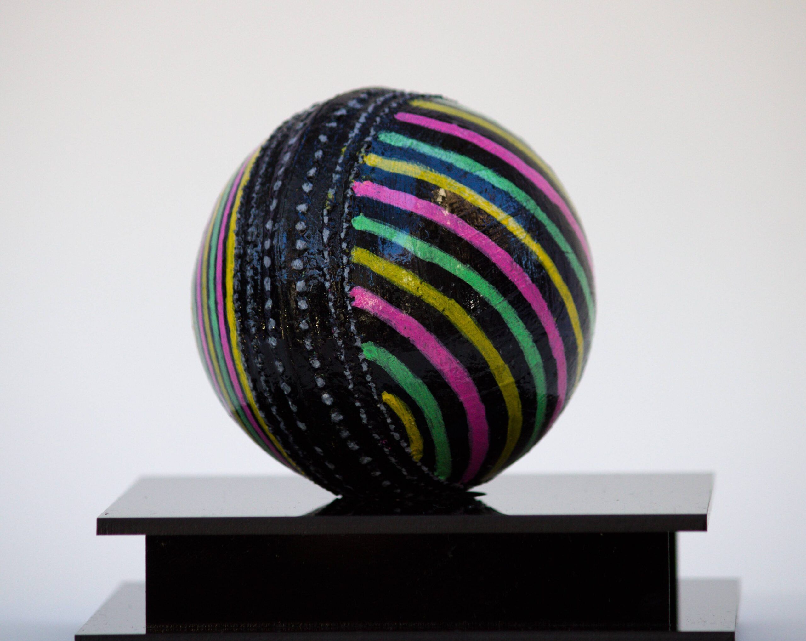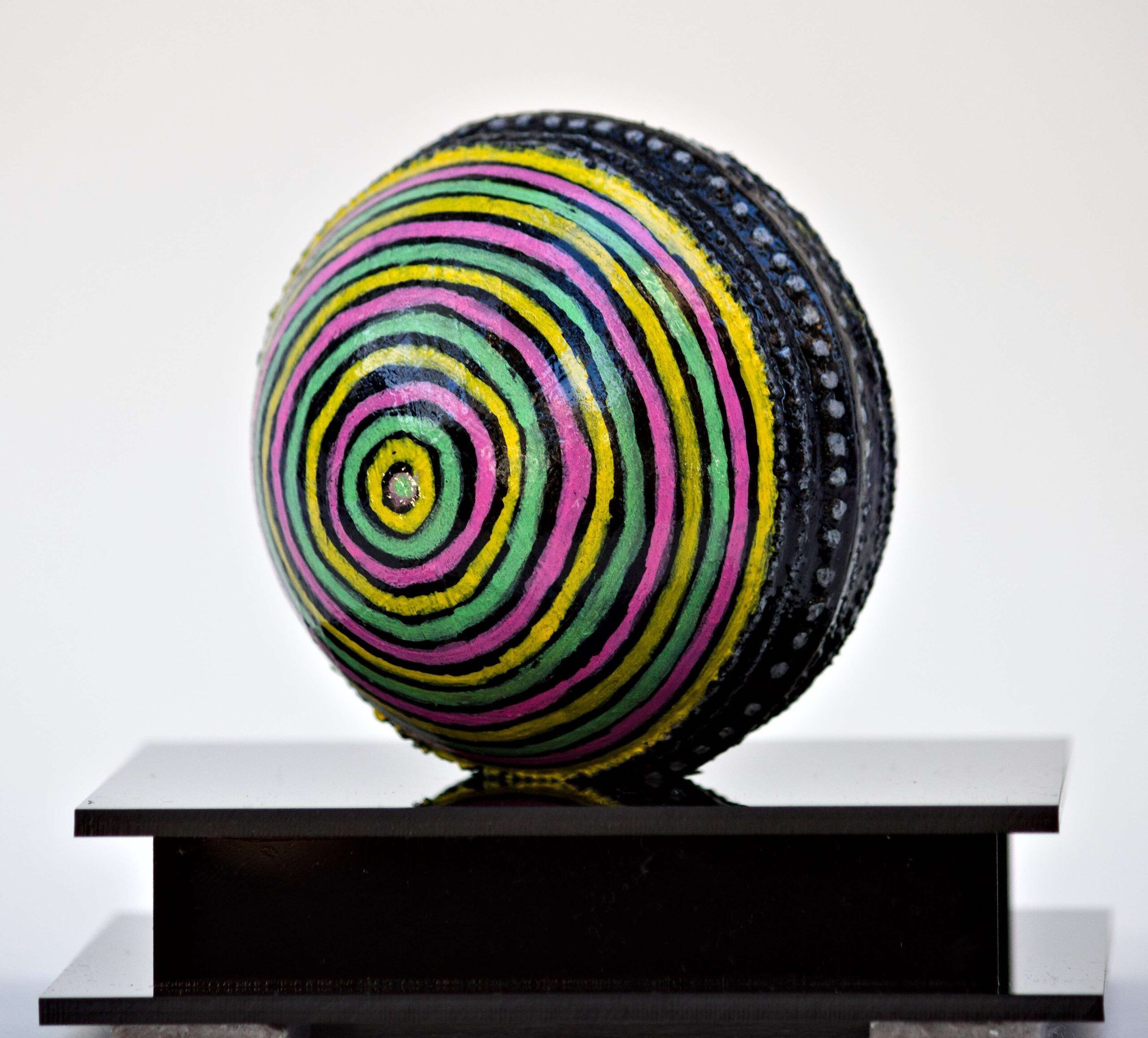 Acrylic paint and protective varnish on Cricket ball with acrylic case
